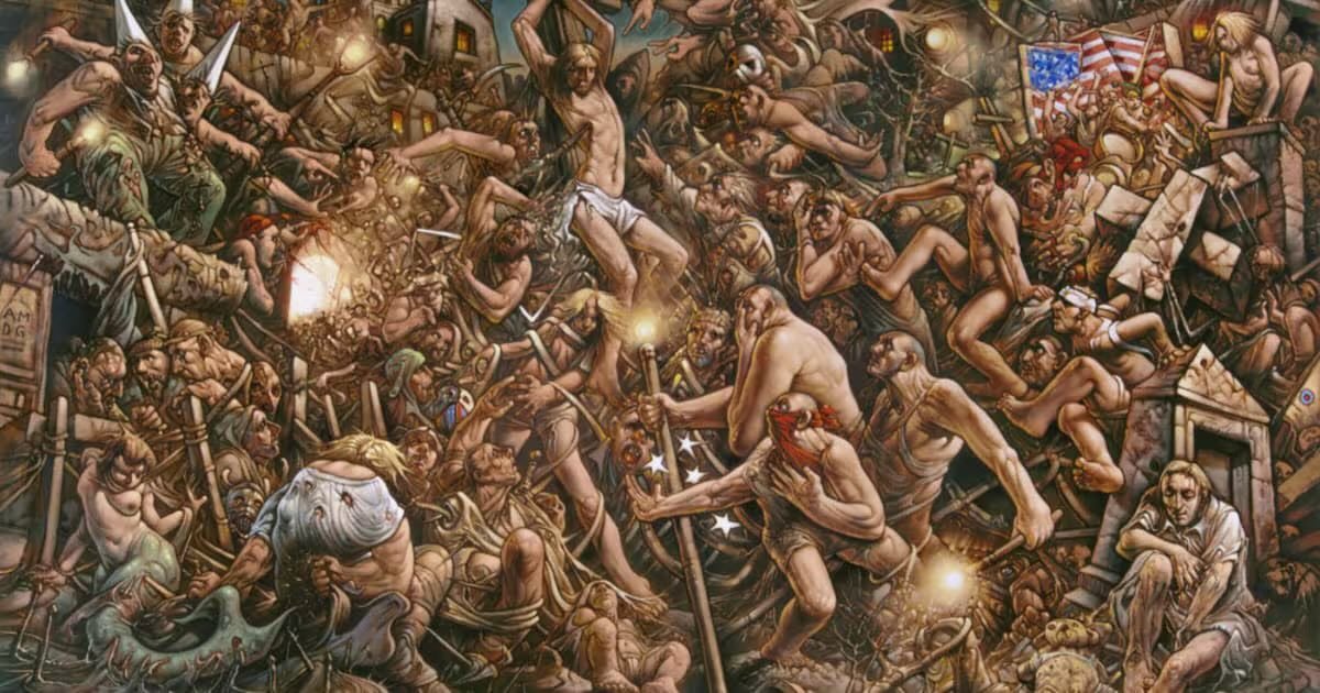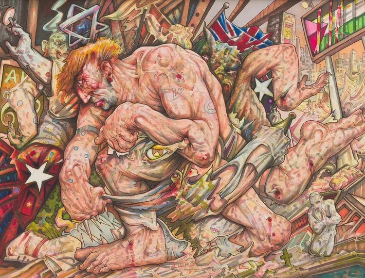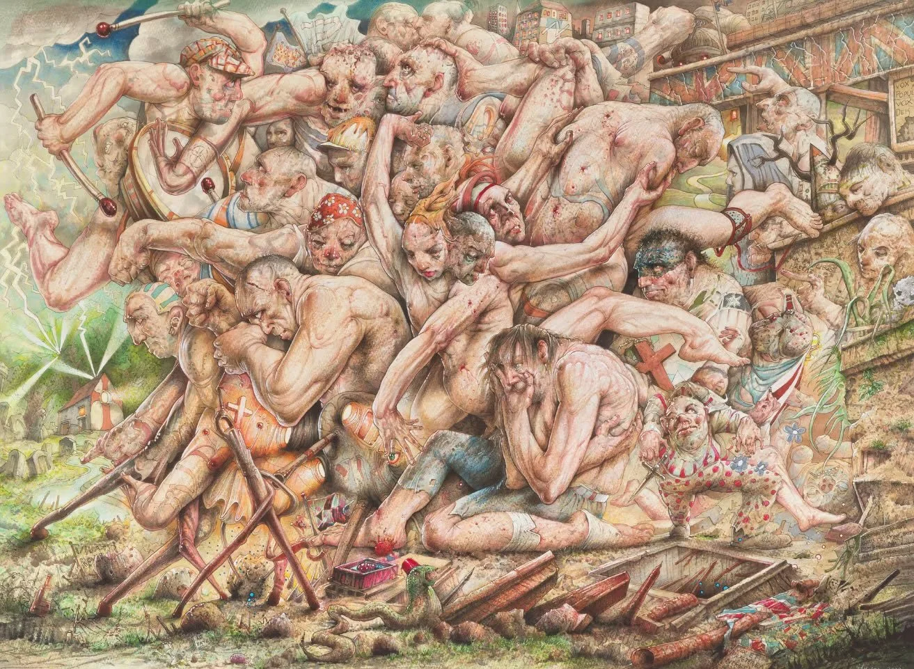 Laurence Fuller: Prophecy by Peter Howson is a sprawling tapestry of humanity laid bare — a symphony of chaos and salvation, where every figure thrashes against the tide of history and morality. It is not merely a painting but an altar of human frailty and resilience. The central figure, bearing the cross, is not just a Christ-like symbol but an embodiment of burden, misunderstood yet unyielding, illuminated by his faith in the face of pandemonium.